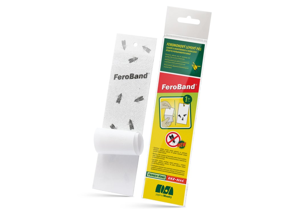 Jednostranně lepicí papírový pás opatřený feromonem, který zaručuje účinný odchyt samců 4 druhů potravinových molů - zavíječe skladištního (Ephestia elutella), moučného (Ephestia kuehniella), datlového (Ephestia cautella) a paprikového (Plodia interpunctella).